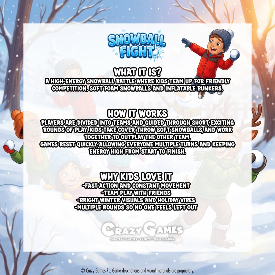 Game Details: • Designed for ages 4+ • Team-based competitive gameplay • Soft foam snowballs for safe play • Inflatable bunkers for cover and strategy • Fast rounds with high player rotation