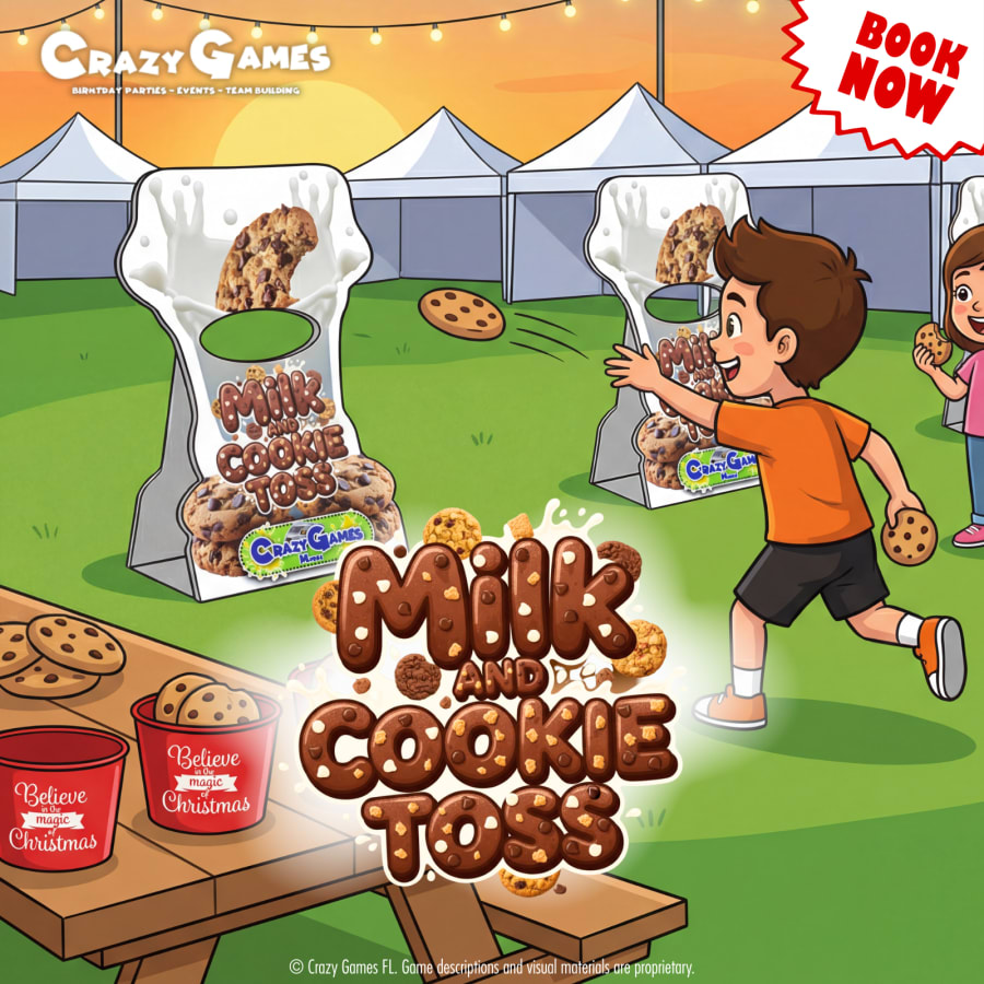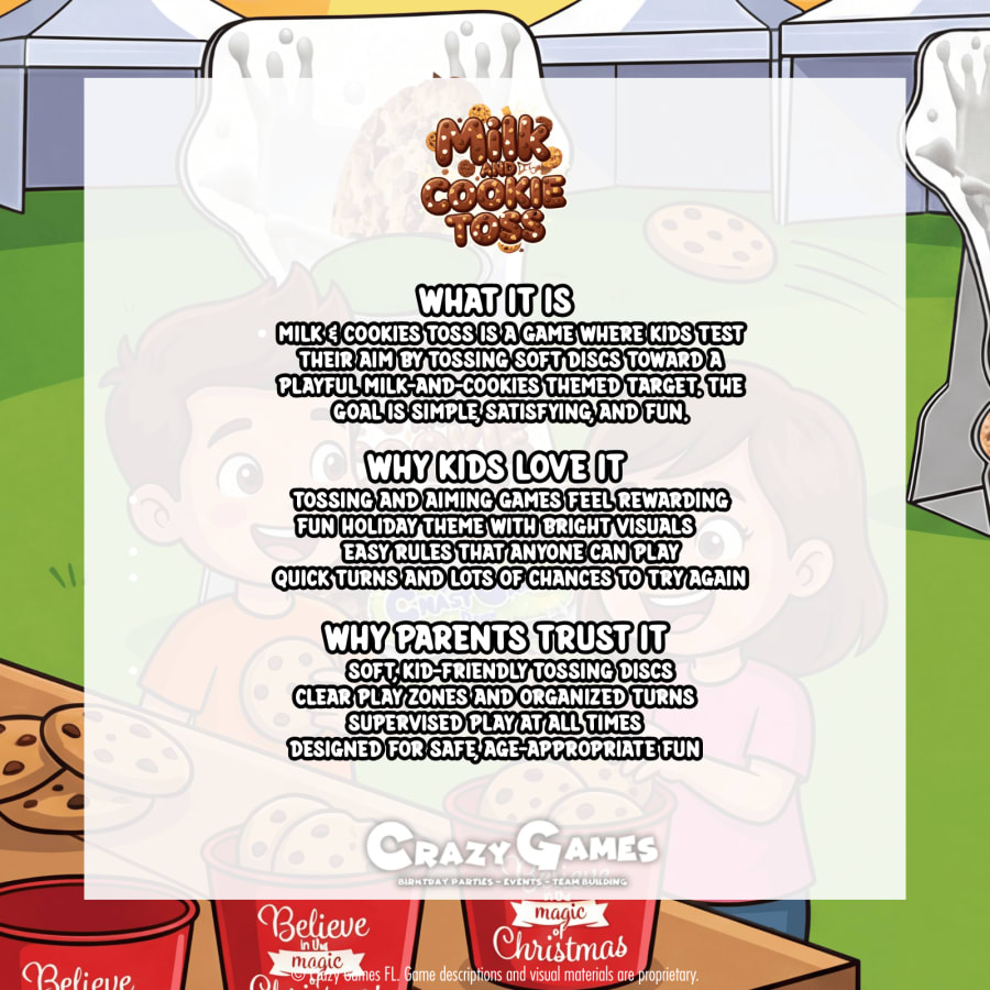 Milk & Cookie Toss is a playful, holiday-themed game that challenges kids to toss soft “cookies” into the milk targets. Easy to understand and fun for all skill levels, this game keeps players engaged with quick turns and lots of cheering. Its charming theme and fast-paced gameplay make it a great addition to winter events, school celebrations, and family-friendly gatherings.