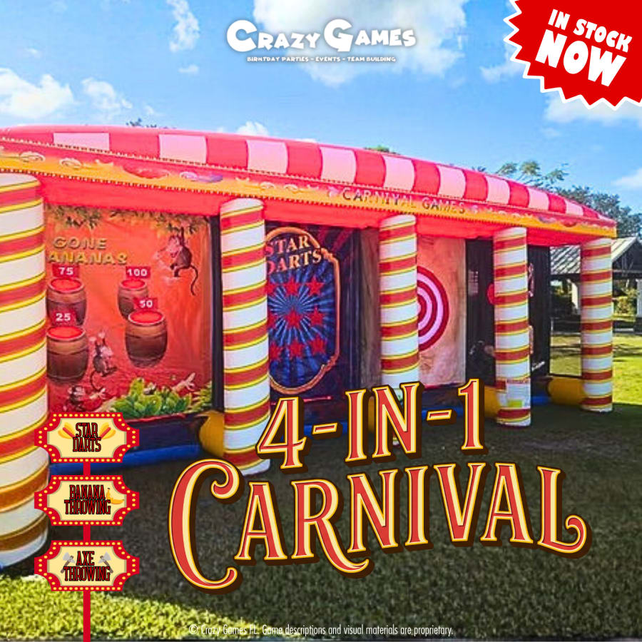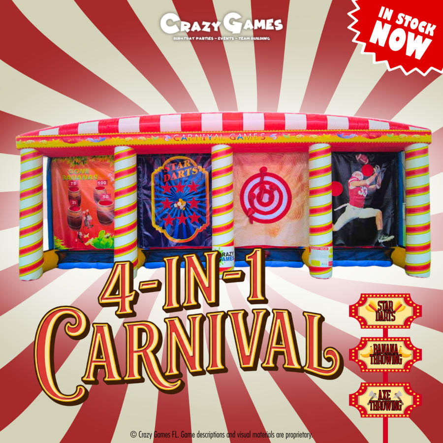 What’s Included: • 4-in-1 Carnival inflatable unit • Game pieces for each activity • Professional setup and takedown • Safety anchoring equipment