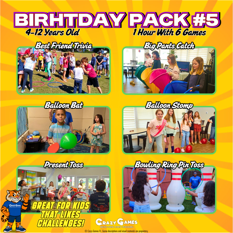 The pack #5 is designed for kids who enjoy interactive challenges, precision games, and fun head-to-head moments. This 1-hour birthday party features 6 engaging challenge games that keep kids thinking and moving.